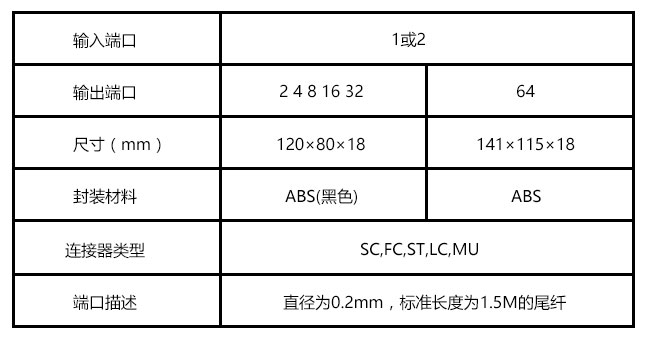 产品描述:盒式封装光分路器有体积小,工作波长范围宽,可靠性高,分光均匀性好的特点,特别适用于无源光网络(EPON、BPON、GPON等)中连接局端和终端设备并实现光信号的分路
